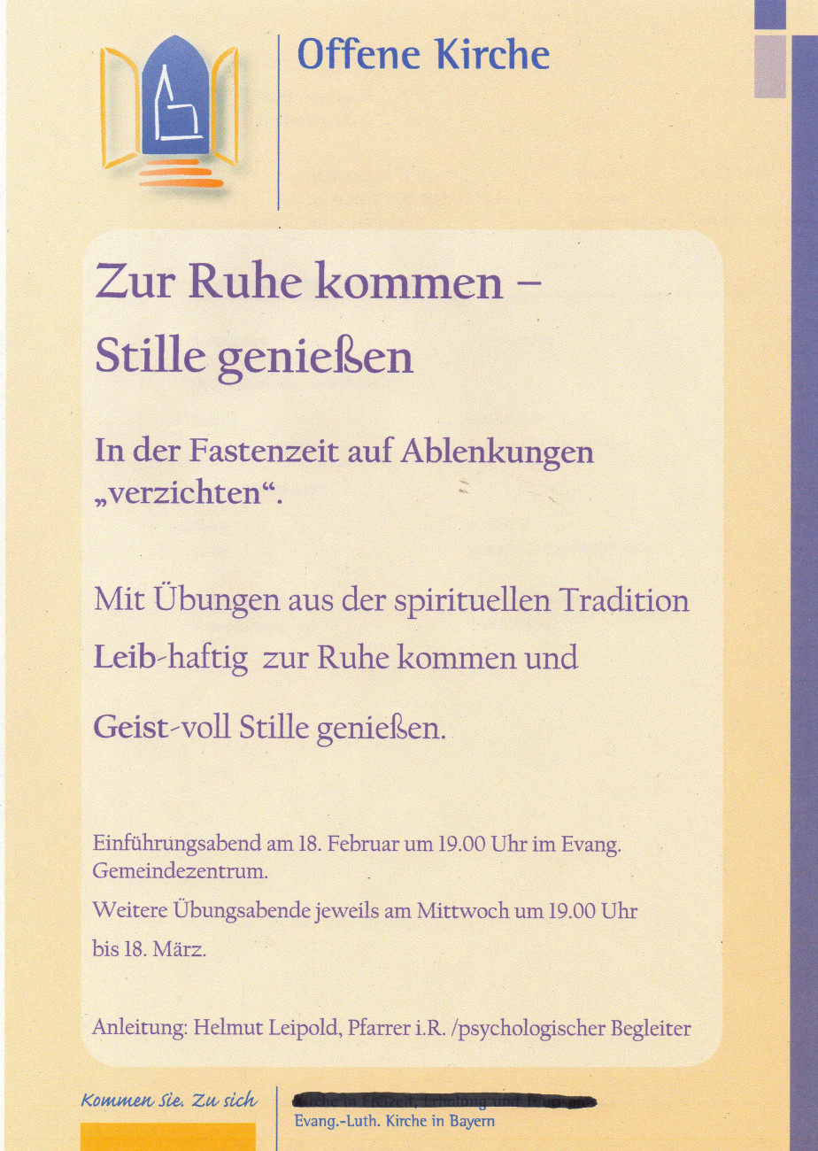 Einführungsabend am 18. Februar um 19.00 Uhr im Gemeindezentrum. Weitere Übungsabende jeweils am Mittwoch um 19.00 Uhr bis 18. März.